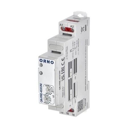 Relé monofuncional com 1 função de tempo e 8 faixas de tempo; Contatos AgSnO2 adequados para operação com cargas indutivas; tensão de entrada universal (AC/DC); baixo consumo de