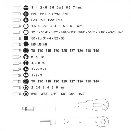 Hexagonal: 1,5 / 2 / 2,5 / 3 / 4 / 5 / 5,5 / 6 / 8 mm.