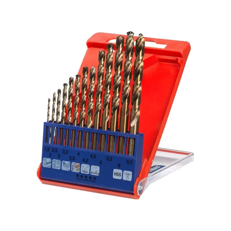 Conforme DIN 338, corte à direita, tipo N, com liga de cobalto 5%, retificação de precisão, cor bronze, ângulo agudo de 135°, com corte transversal conforme DIN 1412 C, autocentrante, cilíndrico, qualidade industrial, extrema resistência ao calor para materiais difíceis de usinar, como aço ligado e não ligado, aço inoxidável V2A/V4A, ferro fundido cinzento e aço fundido, bronze, plásticos.