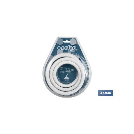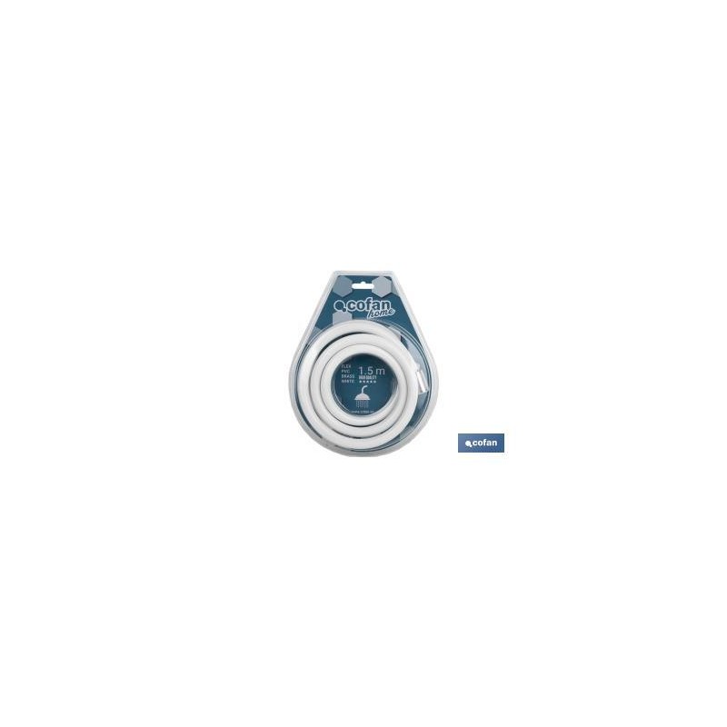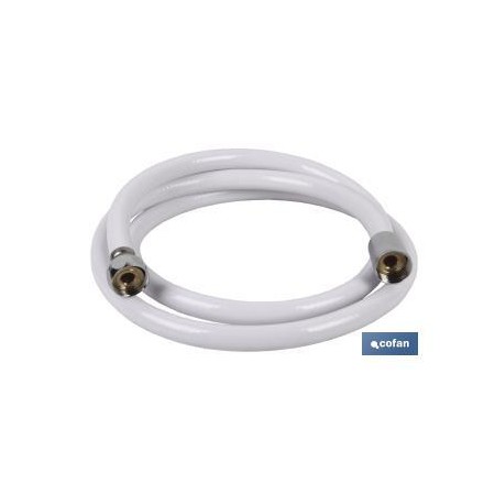Mangueira de chuveiro, o seu tubo interior é fabricado PVC, o seu revestimento é feito de material inoxidável em cor branco e com acessórios de latão.