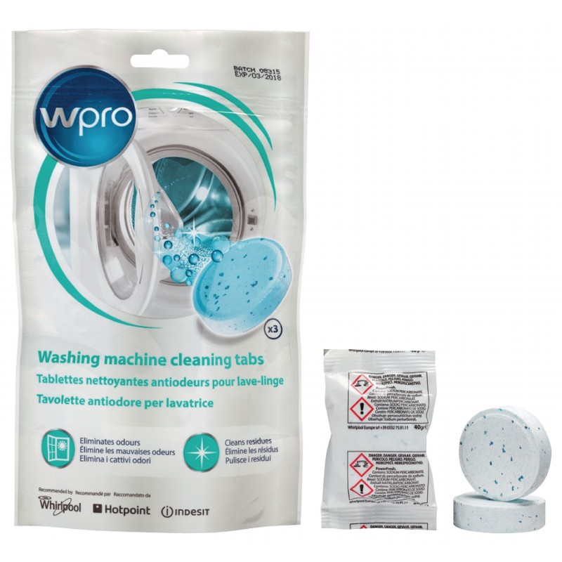 As pastilhas higienizadoras e anti odores para máquinas de lavar Wpro eliminam os maus odores e resíduos da sua máquina de lavar